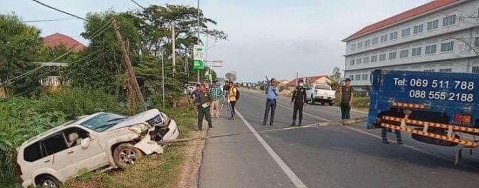 រថយន្តមួយគ្រឿង រេចង្កូតទៅបុកបង្គោលភ្លើងរួចធ្លាក់ចូលស្រះ