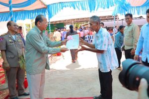 វិញ្ញាបនបត្រសម្គាល់ម្ចាស់អចលនវត្ថុចំនួន ៦ ៦៧២ បណ្ណ ត្រូវបានចែកជូនបងប្អូនប្រជាពលរដ្ឋនៅភូមិនារាយណ៍ និងភូមិព្រៃស្បូវ ឃុំនារាយណ៍ ស្រុកឈូក ភូមិត្រពាំងច្រនៀង ឃុំស្រែជាខាងជើង ស្រុកដងទង់ និងភូមិខ្ពបរុប ឃុំស្រែចែង ស្រុកជុំគិរី ខេត្តកំពត