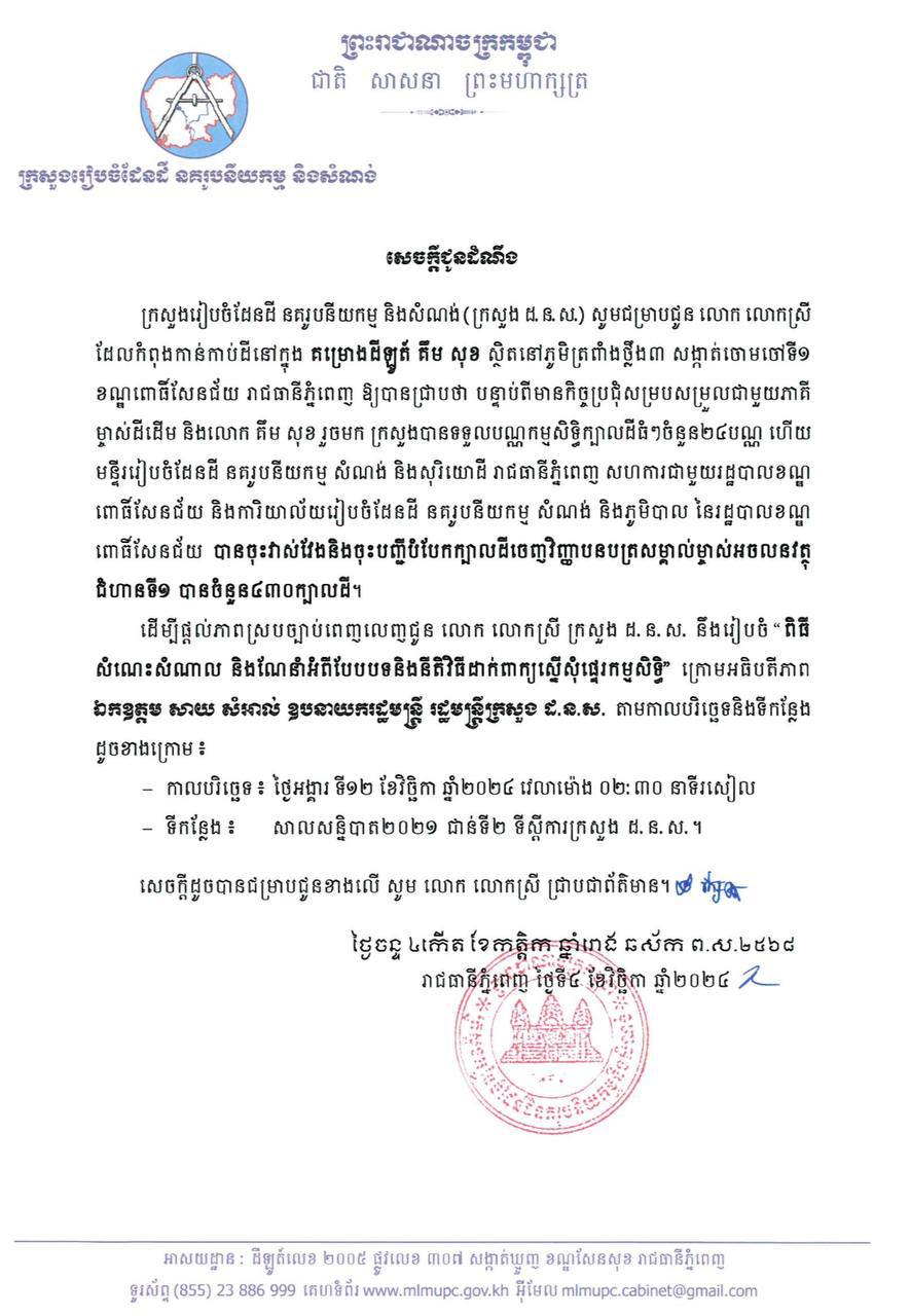 ក្រសួងរៀបចំដែនដី នគរូបនីយកម្ម និងសំណង់ (ដ.ន.ស. ) សូមអញ្ជេីញ លោក លោកស្រី ដែលកំពុងកាន់កាប់ដីនៅក្នុង គម្រោងដីឡូត៍ គឹម សុខ ស្ថិតនៅភូមិត្រពាំងថ្លឹង៣ សង្កាត់ចោមចៅទី១ ខណ្ឌពោធិ៍សែនជ័យ រាជធានីភ្នំពេញ ចូលរួម “ពិធីសំណេះសំណាល និងណែនាំអំពីបែបបទនិងនីតិវិធីដាក់ពាក្យស្នើសុំផ្ទេរកម្មសិទ្ធិ” ក្រោមអធិបតីភាព ឯកឧត្តម សាយ សំអាល់ ឧបនាយករដ្ឋមន្ត្រី រដ្ឋមន្ត្រីក្រសួង ដ.ន.ស. តាមកាលបរិច្ឆេទនិងទីកន្លែង ដូចខាងក្រោម៖