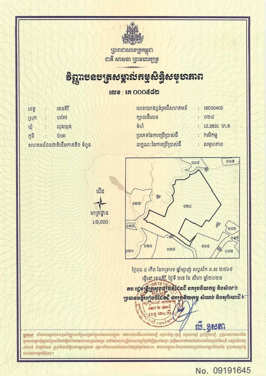 ២. ក្បាលដីលេខ ០២៤ មានទំហំ ១២.២៦៣១ ហិកតា ស្ថិតនៅភូមិប៉ាអរ ឃុំលុងឃុង ស្រុកបរកែវ ខេត្តរតនគិរី។