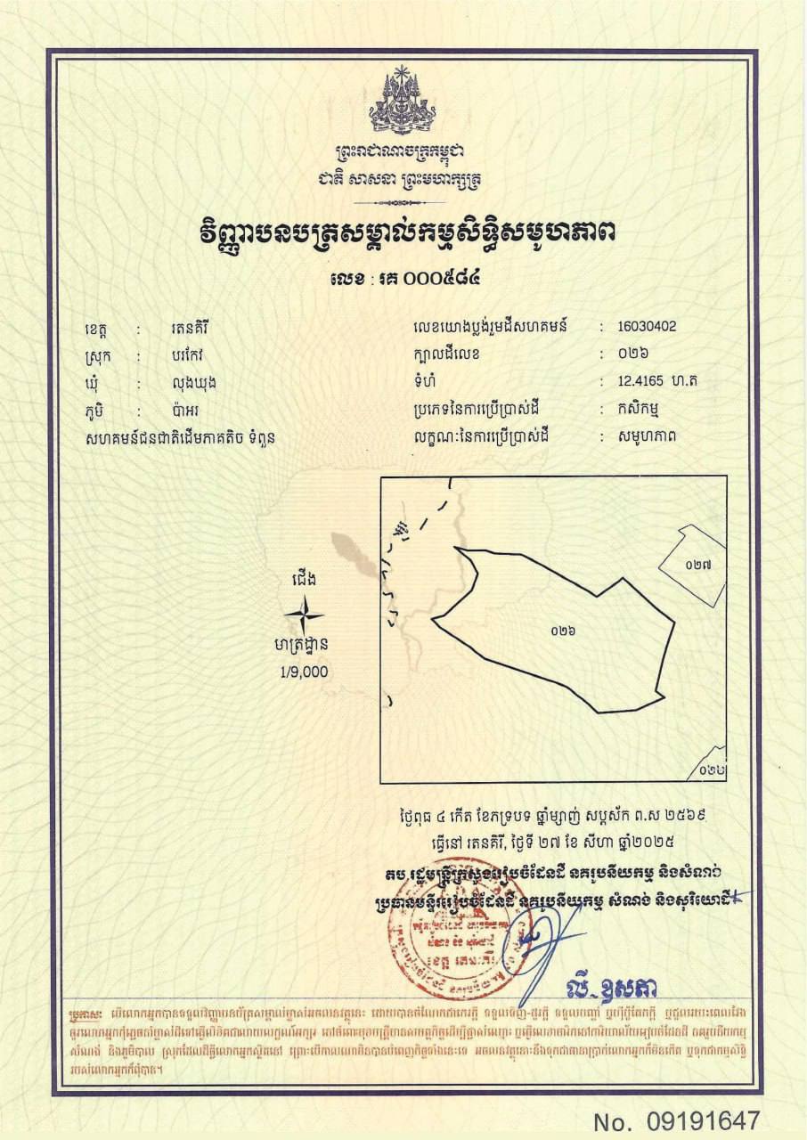 ៤. ក្បាលដីលេខ ០២៦ មានទំហំ ១២.៤១៦៥ ហិកតា ស្ថិតនៅភូមិប៉ាអរ ឃុំលុងឃុង ស្រុកបរកែវ ខេត្តរតនគិរី។