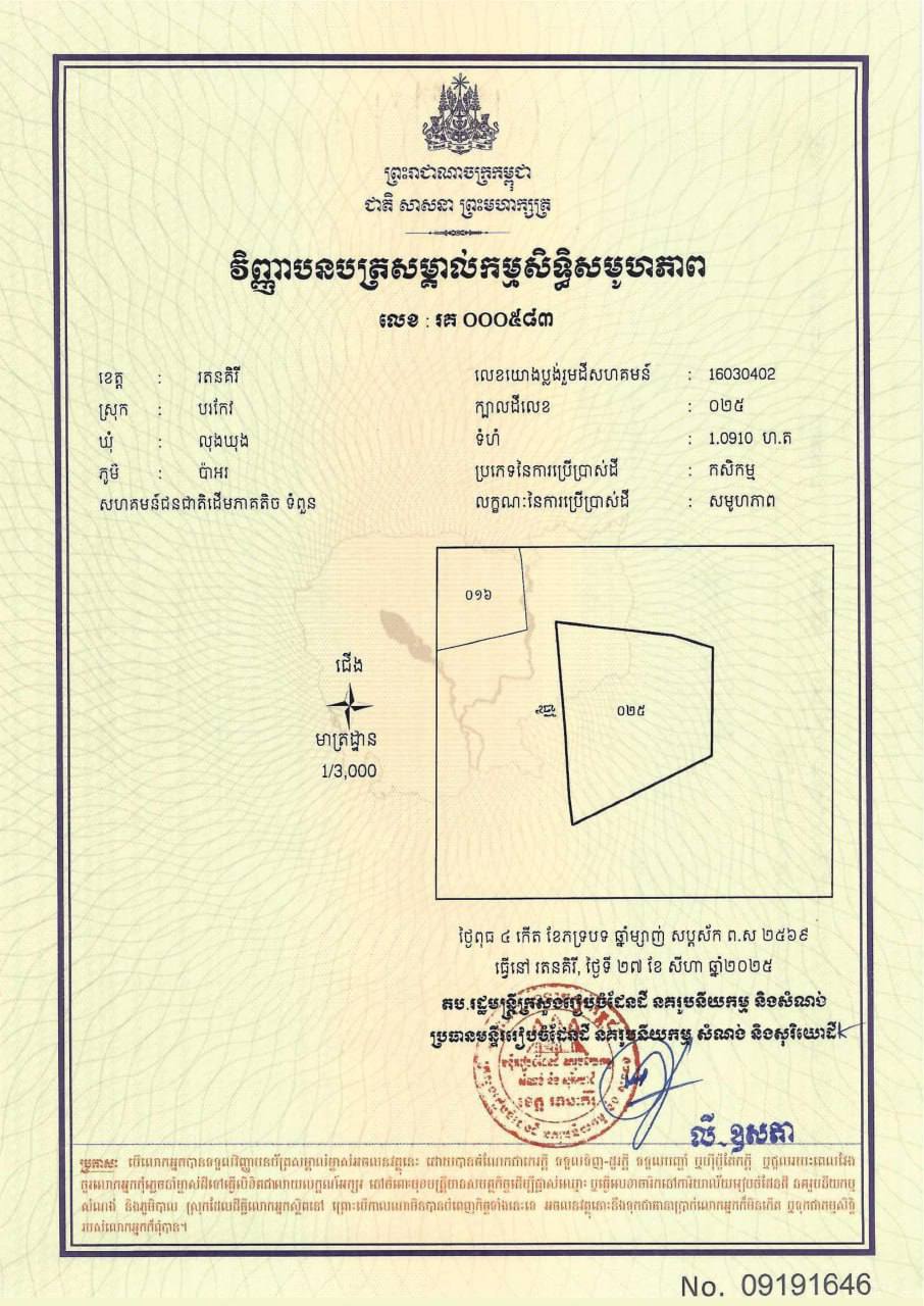 ៣. ក្បាលដីលេខ ០២៥ មានទំហំ ១.០៩១០ ហិកតា ស្ថិតនៅភូមិប៉ាអរ ឃុំលុងឃុង ស្រុកបរកែវ ខេត្តរតនគិរី។