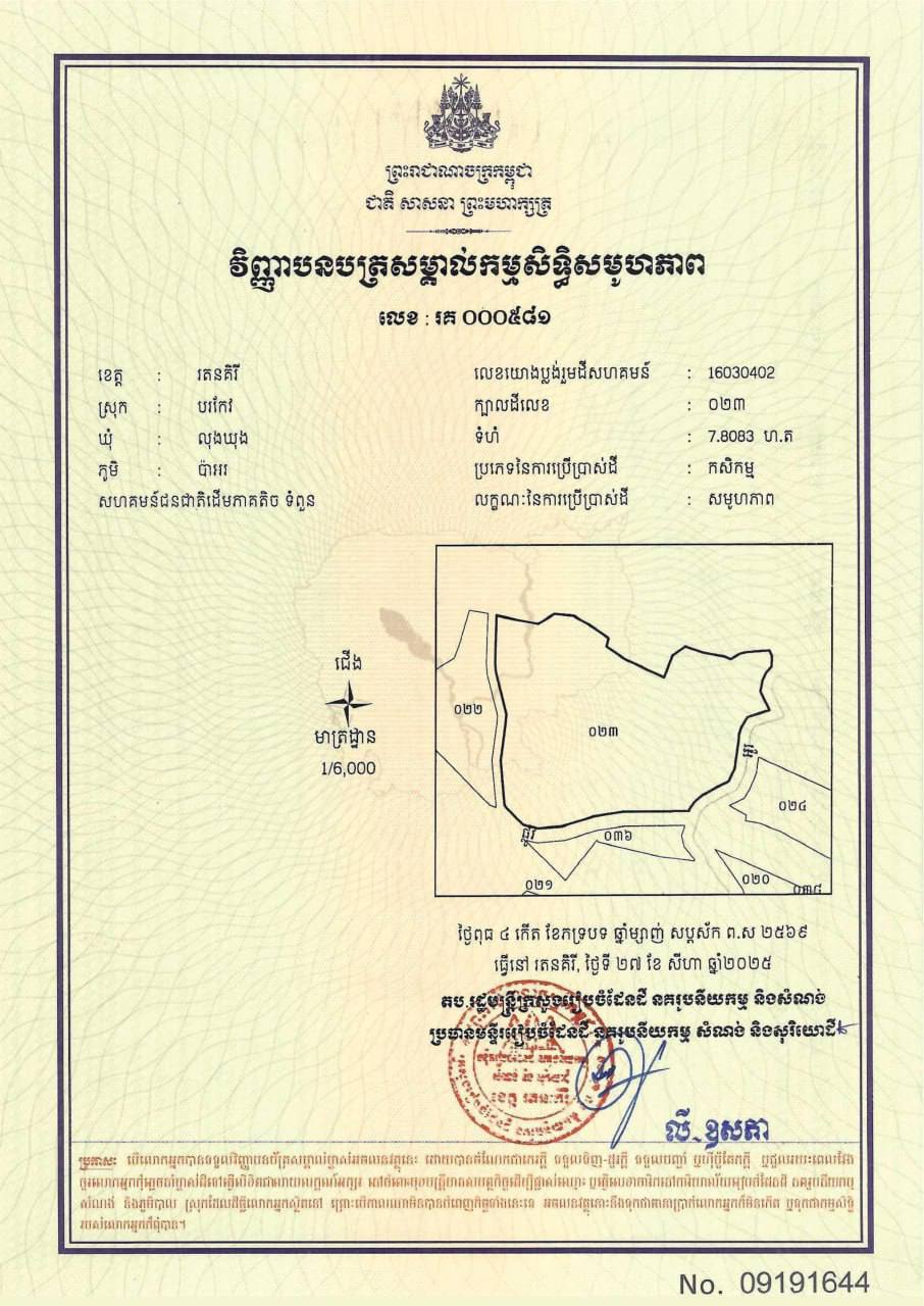 ១. ក្បាលដីលេខ ០២៣ មានទំហំ ៧.៨០៨៣ ហិកតា ស្ថិតនៅភូមិប៉ាអរ ឃុំលុងឃុង ស្រុកបរកែវ ខេត្តរតនគិរី។