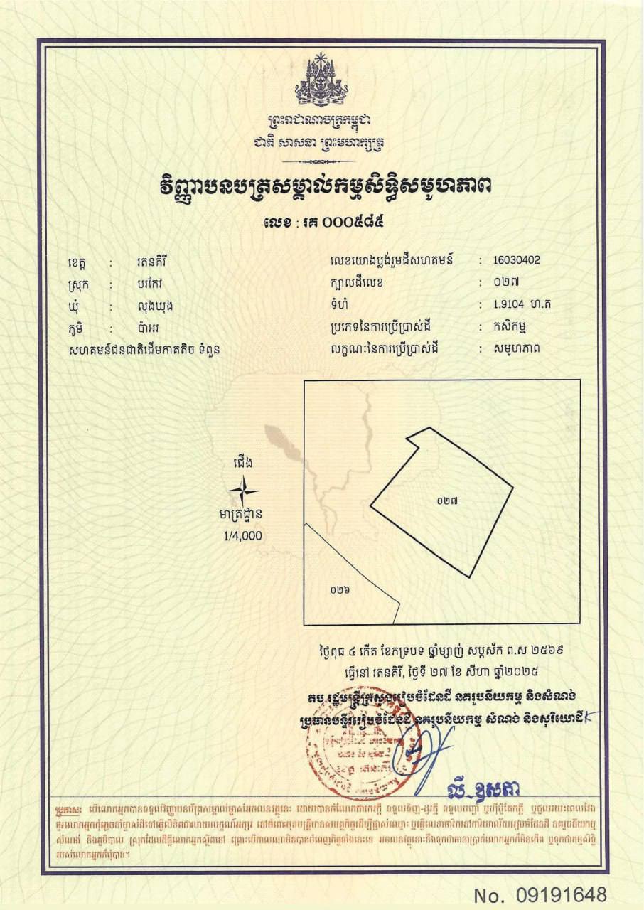 ៥. ក្បាលដីលេខ ០២៧ មានទំហំ ១.៩១០៤ ហិកតា ស្ថិតនៅភូមិប៉ាអរ ឃុំលុងឃុង ស្រុកបរកែវ ខេត្តរតនគិរី។