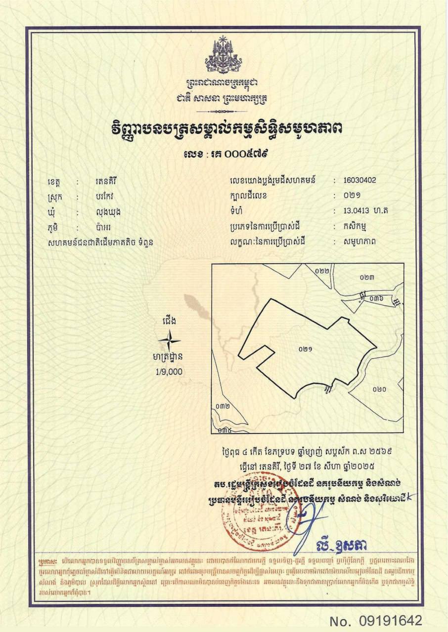 ៤. ក្បាលដីលេខ ០២១ មានទំហំ ១៣.០៤១៣ ហិកតា ស្ថិតនៅភូមិប៉ាអរ ឃុំលុងឃុង ស្រុកបរកែវ ខេត្តរតនគិរី។