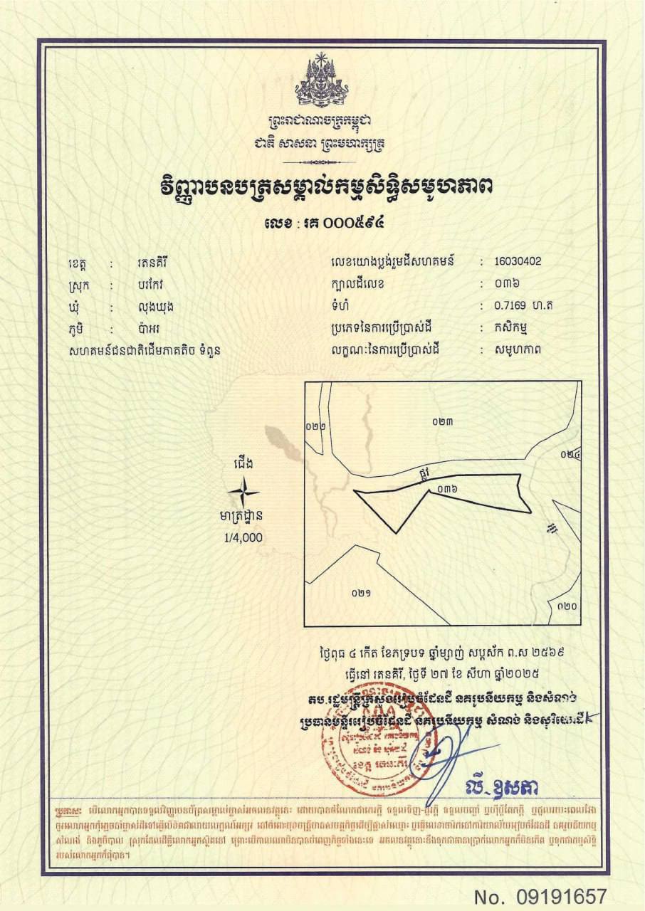 ១.ក្បាលដីលេខ ០៣៦ មានទំហំ ០.៧១៦៩ ហិកតា ស្ថិតនៅភូមិប៉ាអរ ឃុំលុងឃុង ស្រុកបរកែវ ខេត្តរតនគិរី។