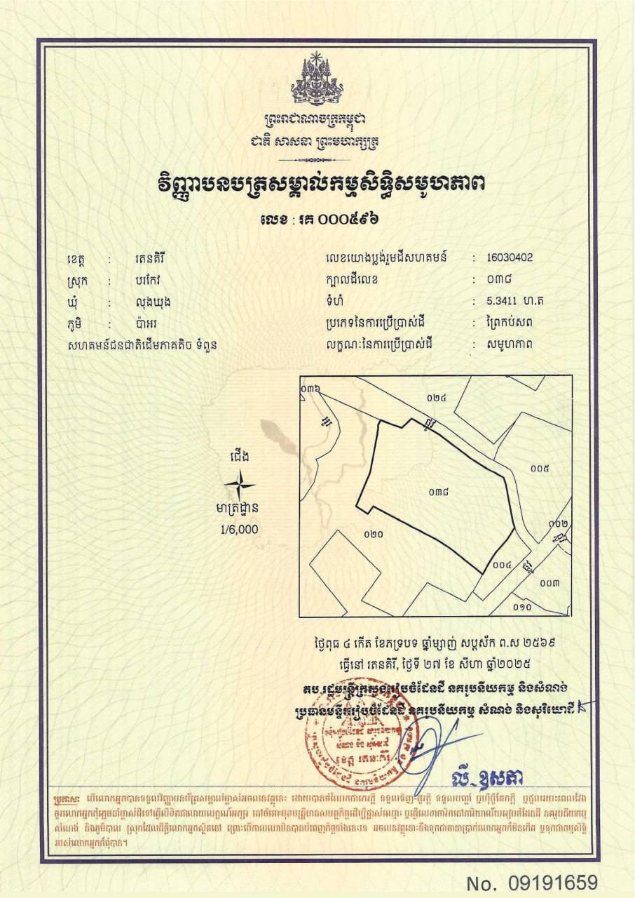 ៣. ក្បាលដីលេខ ០៣៨ មានទំហំ ៥.៣៤១១ ហិកតា ស្ថិតនៅភូមិប៉ាអរ ឃុំលុងឃុង ស្រុកបរកែវ ខេត្តរតនគិរី។