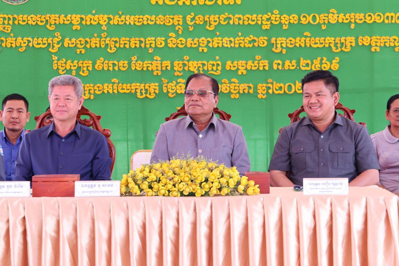 វិញ្ញាបនបត្រសម្គាល់ម្ចាស់អចលនវត្ថុចំនួន ១១,៣៣២​ ប័ណ្ណ​ ជូនបងប្អូនប្រជាពលរដ្ឋ​ ចំនួន១០ភូមិ​ ស្ថិតនៅ​ សង្កាត់ស្វាយជ្រុំ សង្កាត់ព្រែកតាកូវ និងសង្កាត់បាក់ដាវ​ ក្រុងអរិយក្សត្រ ខេត្តកណ្ដាល