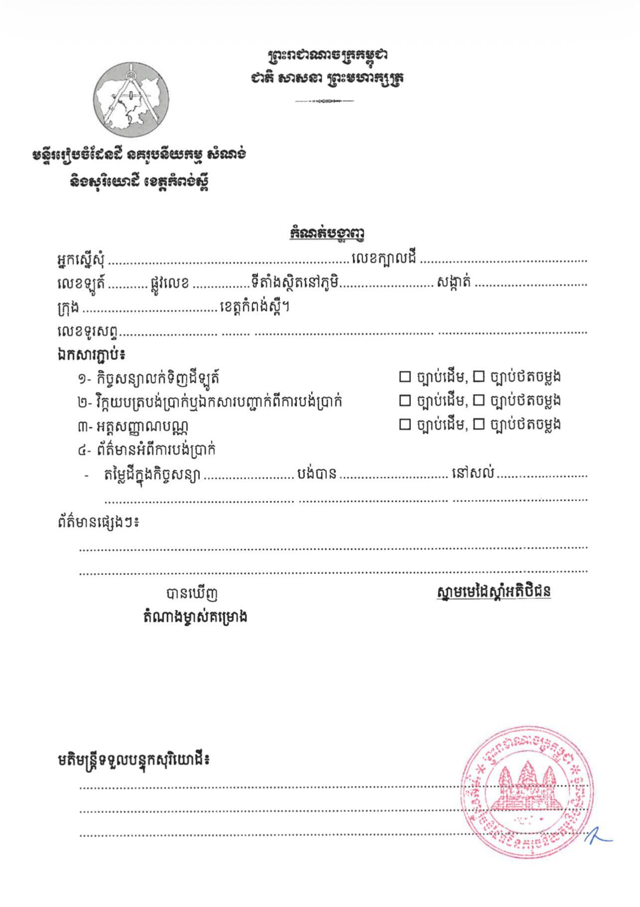 ក្រសួងរៀបចំដែនដីនគររូបនីយកម្ម និងសំណង់អញ្ជើញអតិថិជនរបស់ គម្រោងដីឡូត៍ ខេភី ម៉ន ដានី គម្រោងទី២៣ ស្ថិតនៅភូមិអង្គ្រង ឃុំព្រះស្រែ ស្រុកឧដុង្គម៉ែជ័យ ខេត្តកំពង់ស្ពឺ មកធ្វើបច្ចុប្បន្នភាពទិន្នន័យអតិថិជន