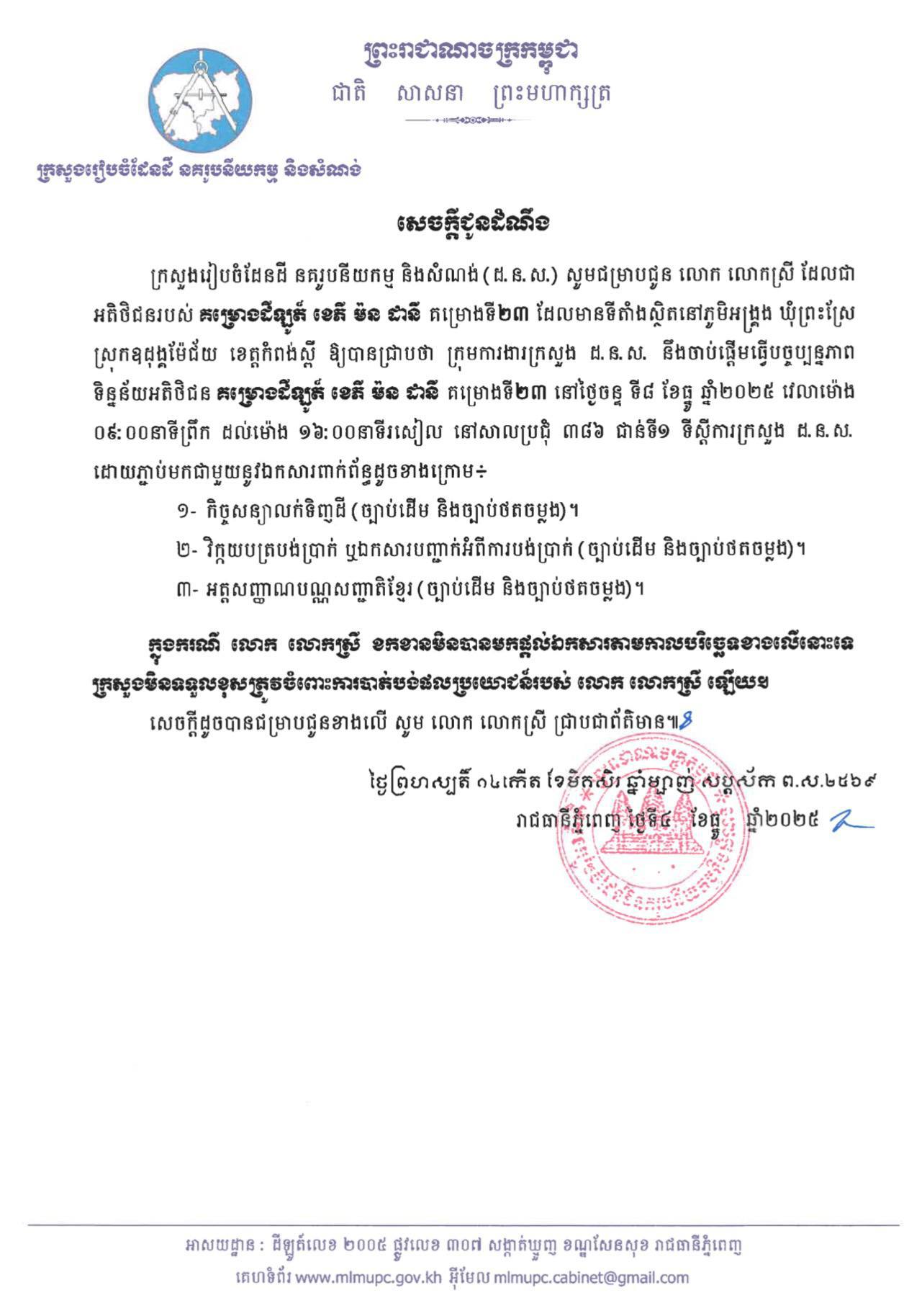 ក្រសួងរៀបចំដែនដីនគររូបនីយកម្ម និងសំណង់អញ្ជើញអតិថិជនរបស់ គម្រោងដីឡូត៍ ខេភី ម៉ន ដានី គម្រោងទី២៣ ស្ថិតនៅភូមិអង្គ្រង ឃុំព្រះស្រែ ស្រុកឧដុង្គម៉ែជ័យ ខេត្តកំពង់ស្ពឺ មកធ្វើបច្ចុប្បន្នភាពទិន្នន័យអតិថិជន ដែលមានរយៈពេល មួយថ្ងៃ គឺនៅថ្ងៃទី៨ ធ្នូ ២០២៥ (ពីម៉ោង ៩ព្រឹក ដល់ម៉ោង ៤ល្ងាច) ដោយភ្ជាប់មកជាមួយនូវឯកសារដូចមានក្នុងសេចក្តីជូនដំណឹង។