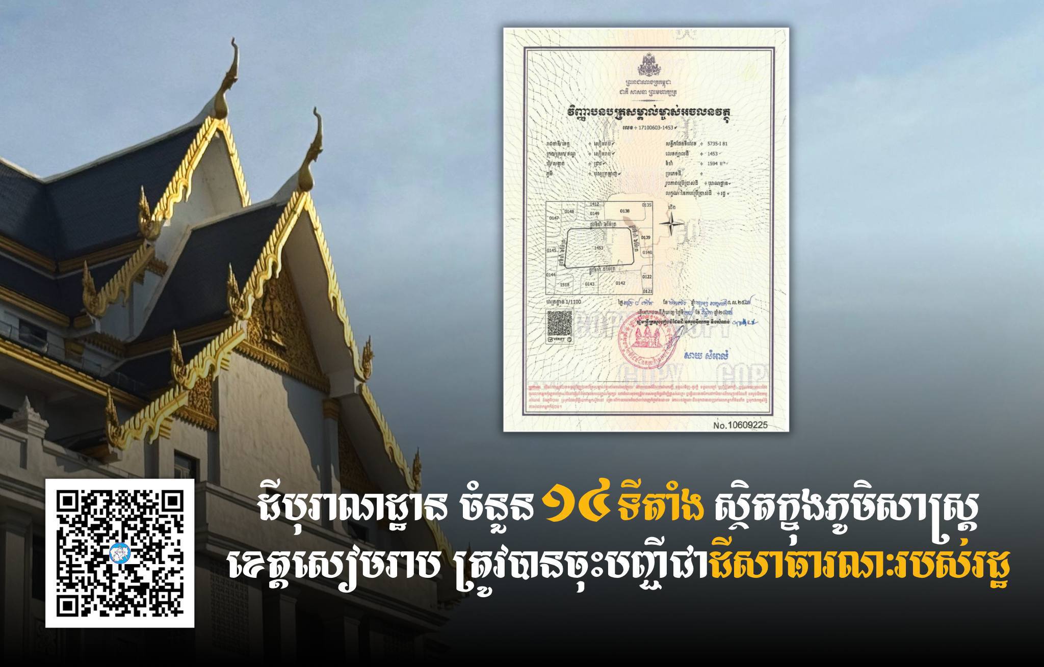 ក្រសួងរៀបចំដែនដី នគរូបនីយកម្ម និងសំណង់ បានបន្តចុះបញ្ជីដីបុរាណដ្ឋាន ចំនួន ១៤ ទីតាំងបន្ថែមទៀត ដែលស្ថិតនៅក្នុងក្រុងសៀមរាប និងស្រុកប្រាសាទបាគង នៃខេត្តសៀមរាប ជាដីសាធារណៈរបស់រដ្ឋ ហើយប្រគល់ជូនក្រសួងវប្បធម៌និងវិចិត្រសិល្បៈ ជាអ្នកកាន់កាប់