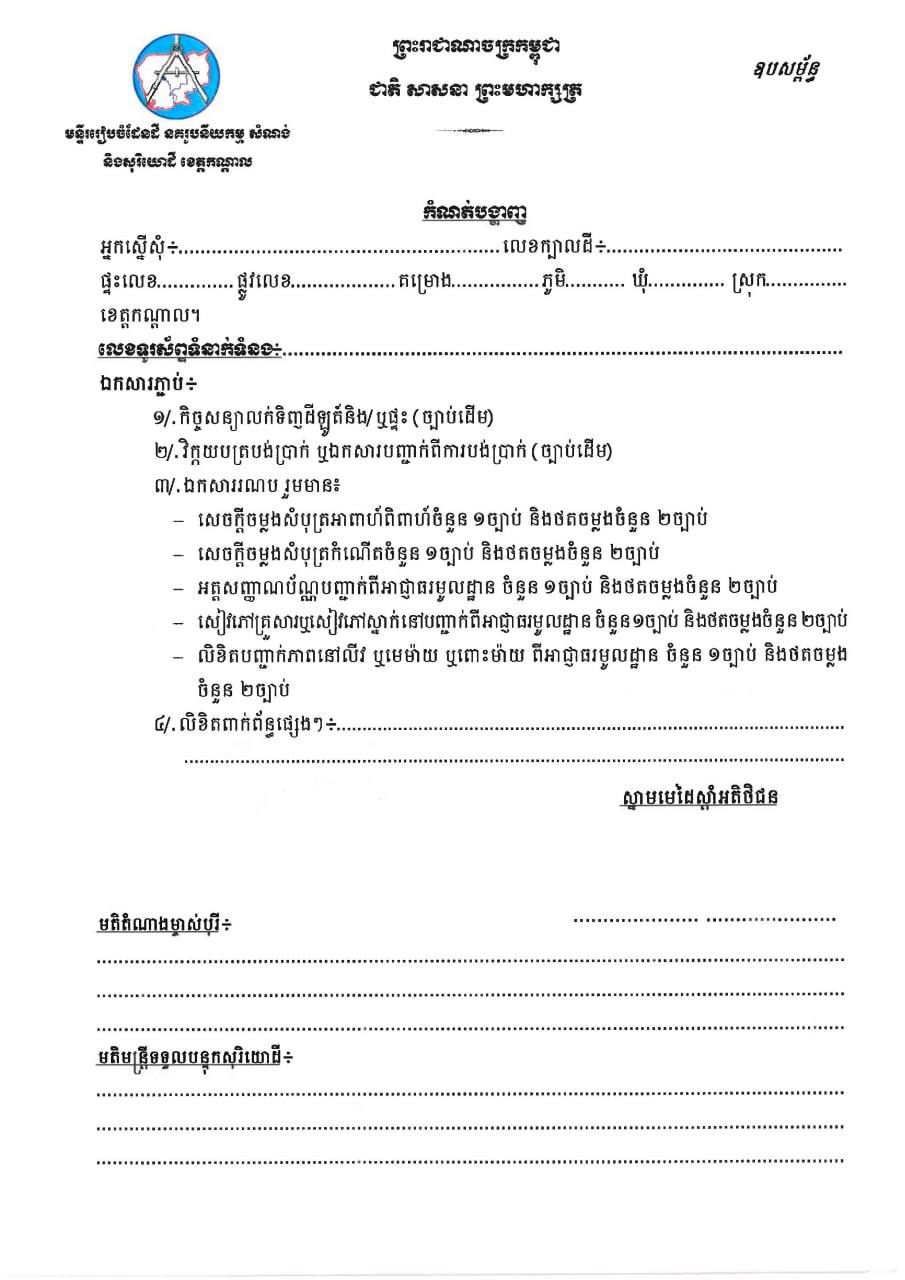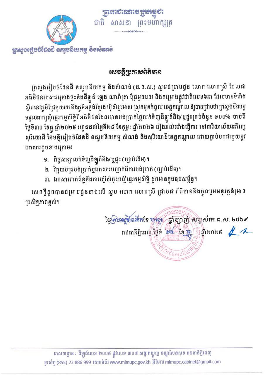 សូមអញ្ជើញអតិថិជនរបស់គម្រោងផ្ទះនិងដីឡូត៍ ឡេង ណាវ៉ាត្រា ជ្រែមួយរយ និងគម្រោងផ្លូវជាតិលេខ៦អា ស្ថិតនៅភូមិជ្រែមួយរយ និងភូមិអន្លង់ស្លែង ឃុំសំបួរមាស ស្រុកមុខកំពូល ខេត្តកណ្តាល មកដាក់ពាក្យស្នើសុំផ្ទេរកម្មសិទ្ធិសម្រាប់អតិថិជនដែលបានបង់ប្រាក់ថ្លៃលក់ទិញដីឡូត៍និង/ឬផ្ទះគ្រប់ចំនួន (១០០%) ចាប់ពីថ្ងៃទី៣០ ខែធ្នូ ឆ្នាំ២០២៥ រហូតដល់ថ្ងៃទី២៨ ខែកុម្ភៈ ឆ្នាំ២០២៦ រៀងរាល់ម៉ោងធ្វើការ ដោយភ្ជាប់មកជាមួយនូវឯកសារពាក់ព័ន្ធដូចមានក្នុងសេចក្តីប្រកាសព័ត៌មាន។