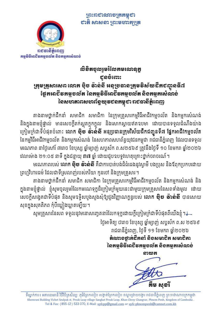 ក្រុមគ្រួសារកម្មវិធីអាជីវកម្មចល័ត និងកម្មករសំណង់ នៃសហភាពសហព័ន្ធយុវជនកម្ពុជារាជធានីភ្នំពេញ សូមចូលរួមរំលែកមរណទុក្ខយ៉ាងក្រៀមក្រំជាមួយគ្រួសារ សពលោក បុិច វ៉ាន់នី