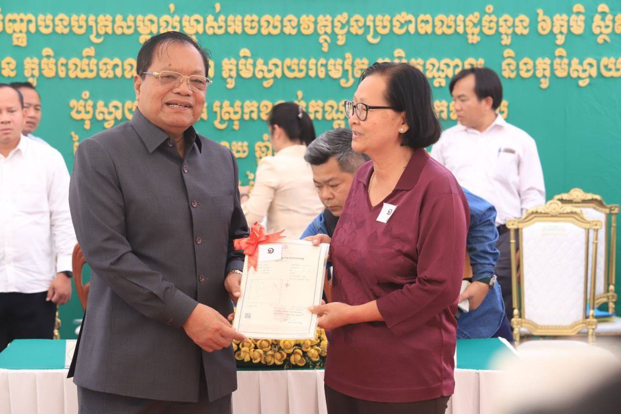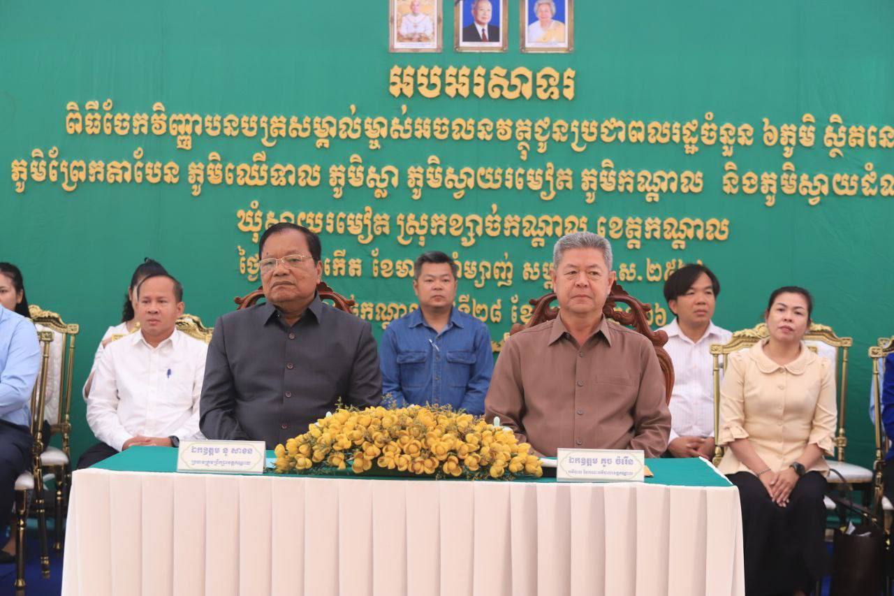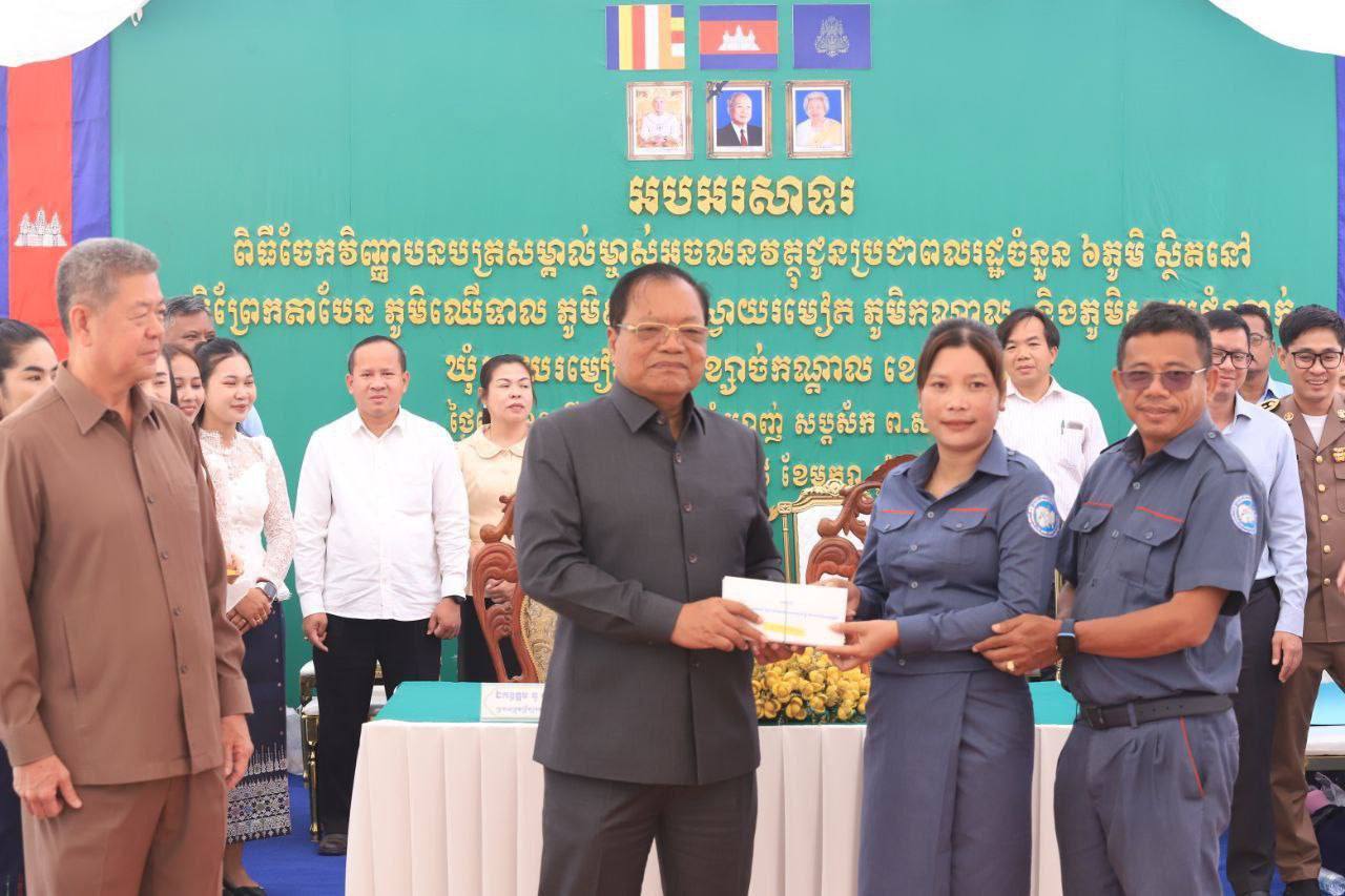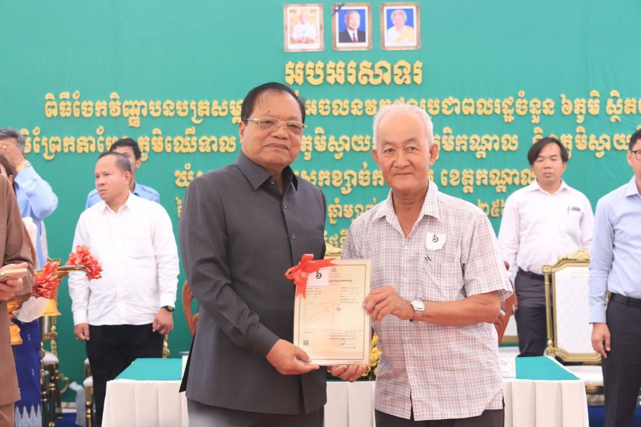 វិញ្ញាបនបត្រសម្គាល់ម្ចាស់អចលនវត្ថុ ចំនួន ៤,២៩១ប័ណ្ណ ត្រូវ​បានប្រគលជូនប្រជាពលរដ្ឋក្នុង ៦ភូមិ រួមមាន ភូមិព្រែកតាបែន ឈើទាល ស្លា ស្វាយរមៀត កណ្ដាល និងស្វាយដំណាក់ ឃុំស្វាយរមៀត ស្រុកខ្សាច់កណ្ដាល ខេត្តកណ្ដាល
