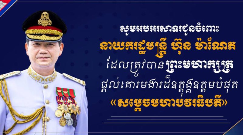 ឯកឧត្តមឧត្តមសេនីយ៍ឯក រ័ត្ន ស្រ៊ាង មេបញ្ជាការរងកងរាជអាវុធហត្ថលើផ្ទៃប្រទេស និងជាមេបញ្ជាការកងរាជអាវុធហត្ថរាជធានីភ្នំពេញ សូមអបអរសាទរដោយស្មោះជូនចំពោះនាយករដ្ឋមន្រ្តី ហ៊ុន ម៉ាណែត ក្នុងឱកាសដែលឯកឧត្តមត្រូវបានព្រះករុណាព្រះបាទសម្តេចព្រះបរមនាថ នរោត្តម សីហមុនី ព្រះមហាក្សត្រនៃកម្ពុជា ចេញព្រះរាជក្រឹត្យត្រាស់បង្គាប់ផ្តល់គោរមងារដ៏ឧត្តុង្គឧត្តមខ្ពង់ខ្ពស់បំផុតជា «សម្តេចមហាបវរធិបតី»។ នាយករដ្ឋមន្រ្តី ហ៊ុន ម៉ាណែត ពិតជាស័ក្តិសមបំផុតចំពោះការទទួលបាននូវគោរមងារដ៏ឧត្តុង្គឧត្តមខ្ពង់ខ្ពស់បំផុតជា «សម្តេចមហាបវរធិបតី»។ ការផ្តល់គោរមងារនេះពិតជាស័ក្តិសមបំផុតសម្រាប់មុខតំណែងដ៏ខ្ពស់បំផុតក្នុងប្រទេសកម្ពុជា