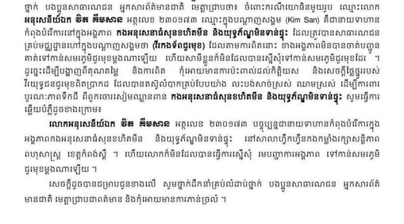 កងអនុសេនាធំ សុនខហិតមីន នៃមជ្ឈមណ្ឌលជាតិរក្សាសន្តិភាព ខ្ញុំបាទសូមធ្វើសេចក្តីស្រាយបំភ្លឺ ពត៏មាន ករណី Facebook ឈ្មោះ Kim San ដែលមានការភាន់ច្រលំជា វីរៈកងទ័ពជួរមុខ ដើម្បីការពារនូវសេចក្តីថ្លៃថ្នូរដល់វិរៈកងទ័ពជួរមុខពិតប្រាកដ
